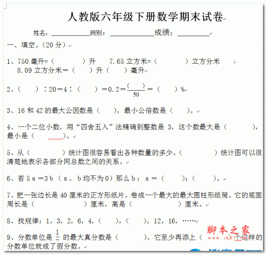 六年级期末数学试卷人教版 2015人教版六年级下册数学期末试卷(含答案) WORD版 下载-